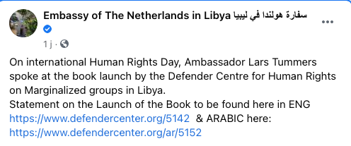 Important launch by the @defender_center of the book on “ Marginalized and vulnerable groups in Libya” on the occasion of International #HumanRightsDay . Please find my full contribution (ENG) at the launch via https://t.co/2TZdksEy82
